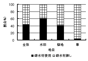 2)実施状況は地目や支庁ごとに暗きょの水準が違った(図1)。水田は整備水準が比較的高いが遅れている地域もあった。畑地では疎水材の有無により整備水準に差があった。草地は土戻し暗きょが主流であった。