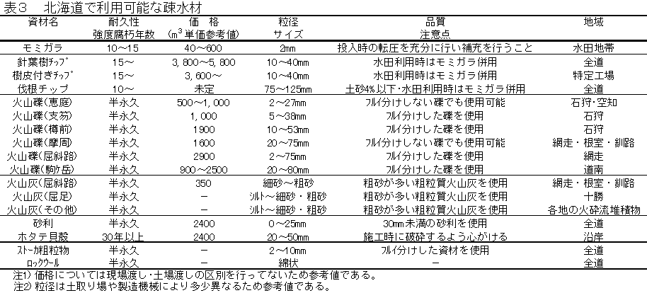 5)北海道で利用可能な疎水材を新たな資材を含めて総合的に提案した(表3)。