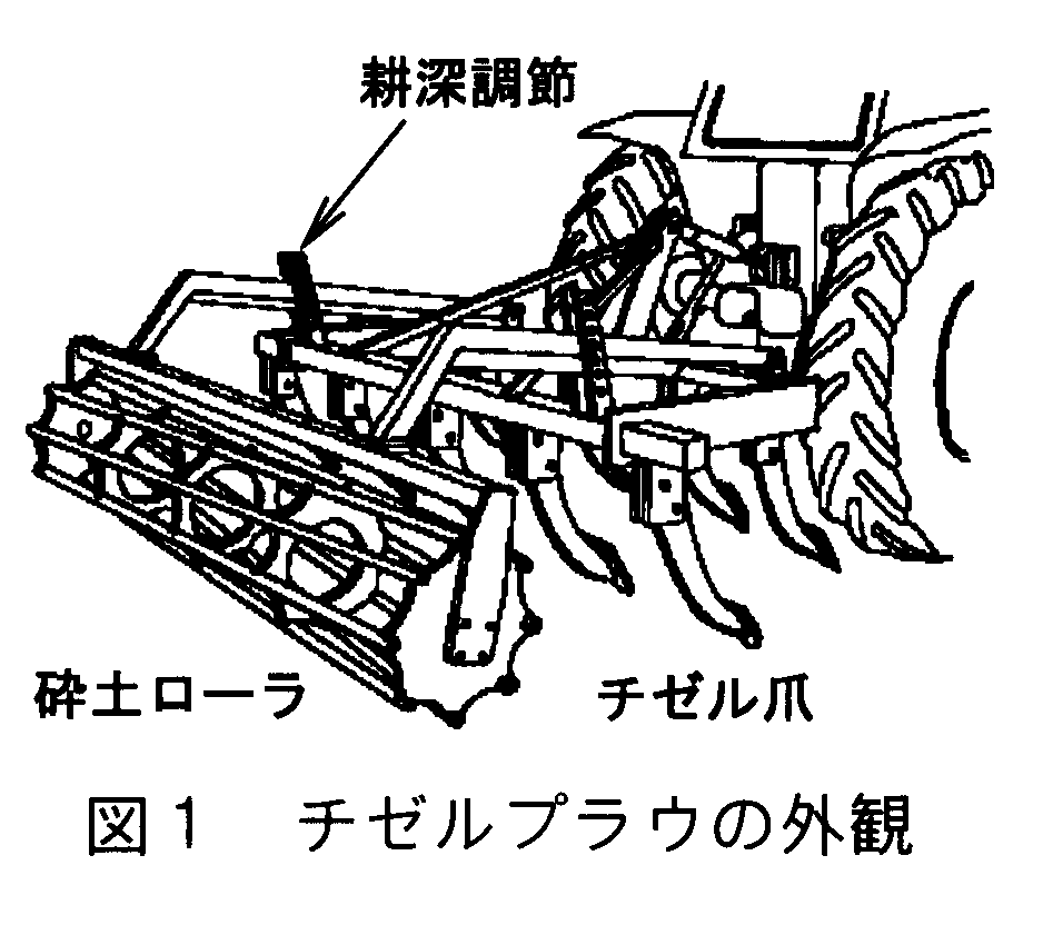 (1)チゼルプラウは、チゼルと呼ばれる細い鉄の爪を25〜30cm間隔で配列し、トラクタでけん引して作土層をひっかくように耕起する作業機である(図1)。爪で耕起された部分は細かく砕土され孔隙が大きく、爪と爪の間の部分は大きな土塊となる。