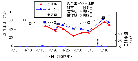 (2)融雪後、チゼルプラウで荒起しを行うと土塊の間隙が大きく、排水が良いため、ロータリ耕起やまったく荒起しをしない圃場に比べて土壌水分が早く低下した(図2)。また、降雨後も表層および下層とも土壌水分が短期間に低下した(図3)。