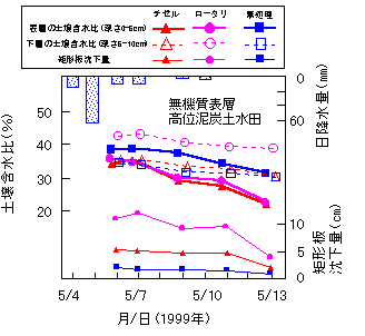 図3 降雨後の土壌含水比と矩形板沈下量の推移