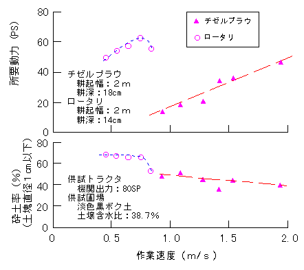 図4 チゼルプラウとロータリの所要動力と砕土率