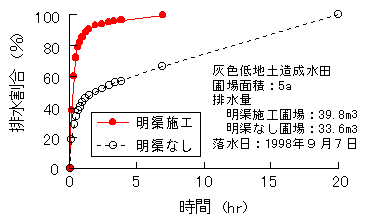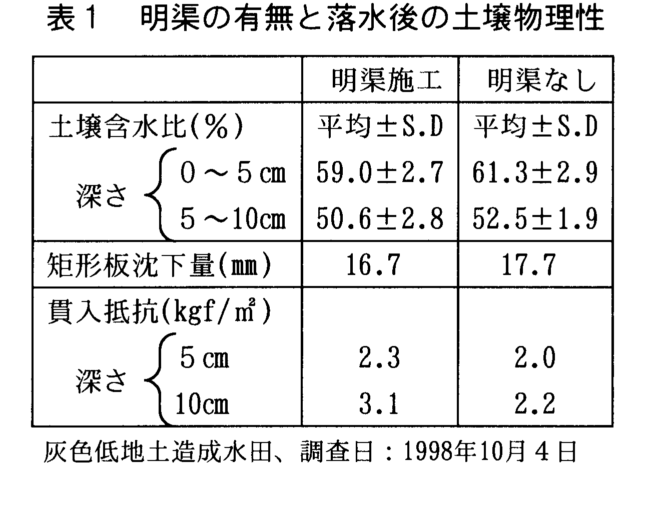 (2)給排水明渠の給水・排水特性:畦畔沿いに明渠を作溝した圃場と明渠のない圃場で給水および排水時間を測定した。さらに、落水後の土壌含水比、矩形板沈下量等を調査した。供試圃場:北農試灰色低地土造成水田、明渠作溝圃場(5a、10×50m)、明渠なし圃場(5a、10×50m)。明渠寸法:溝上幅28㎝、溝底幅25㎝、深さ20㎝。