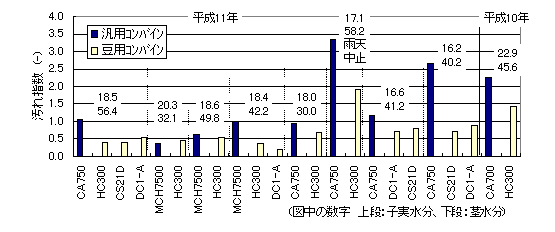(4)コンバイン収穫後の大豆の汚れ指数が0.5程度の時、汎用コンバインと豆用コンバインの汚れ指数はほぼ同じであった。汚れ指数が1.0以上の時、汎用コンバインより豆用コンバインの汚れ指数が小さく、汚れの発生が著しいときほどその指数差は大きかった。