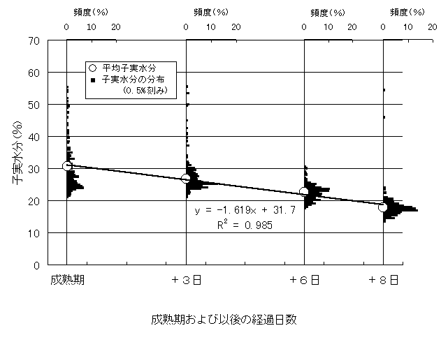 図1 成熟期以降の子実水分の分布と平均子実水分の推移