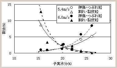 5)ピックアップ収穫では子実水分が高い場合に押傷粒の発生が増加し、低い場合には機械裂皮粒の激増が懸念されることから、脱穀部周速度は子実水分19〜23%範囲では5.0〜6.0m/s程度、19%以下あるいは23%以上では5.0〜5.4m/sが最適と考えられた(図2)。