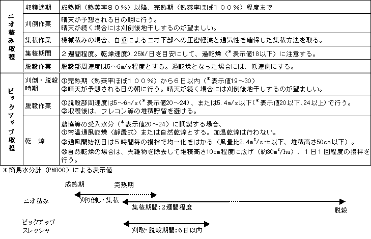 1)子実水分の低下速度は気象等によって変動するので、子実水分を簡易水分計等で測定することが望ましい。