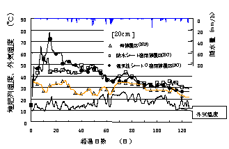 1)供試シートの透気度は74〜1972sec/100ccと大きな差があったが、①無被覆区の蒸発量に対する水蒸気透過量が16〜18%のもの(通気性シートA、B、C)と②水蒸気透過性の低いもの(防水シート、通気性シートO)の2種類に分類された(表2)。
