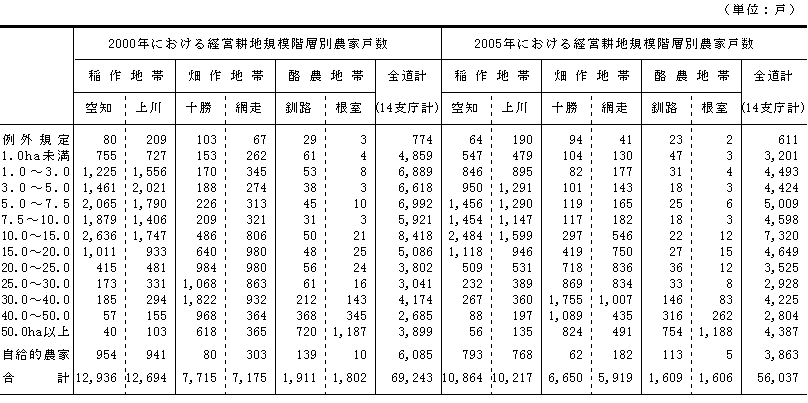 3)本道の主要な農業地帯において行った実態調査によると、稲作地帯では10ha以上層においても兼業農家や高齢農家が少なからず存在することから、近い将来に予想される農地供給過剰への対応として、これらの農家を農地の担い手として位置づけて支援していくことが重要であると考えられた。また、農家1戸当たりの経営規模が大きくなっている地域では、従来のように残存農家が離農跡地を簡単に引き受けることができない状況になっていることから、市町村レベルにおける離農跡地の中間保有機能を有する組織の形成が必要になると考えられた。