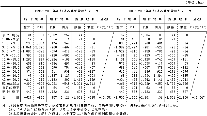 1)2000年および2005年の農業構造予測に基づき(表1)、農地需給の見通しを検討した(表2)。それによると、稲作地帯と酪農地帯では、1995〜2000年において農地供給過剰が顕在化し、2000〜2005年において農地供給過剰の構造が一層強まるものと予測された。稲作地帯では小規模層における離農が、また、酪農地帯では中規模層(20〜40ha層)や大規模層(50ha以上層)における離農が農地供給過剰を引き起こす最大の要因である。