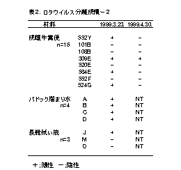 1) 牛ロタウイルスは下痢子牛だけでなく、臨床的に正常な育成牛や成牛からも排泄され、牛舎パドック溜まり水や長靴も感染源になりうることが明らかになり(表1,2)、飼養環境の整備が重要であることが示された。
