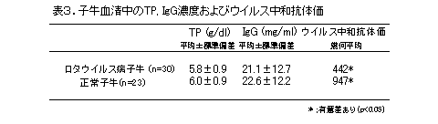 2) ロタウイルス病子牛の血清中ウイルス中和抗体価は正常子牛と比較して低値であった(表3)。ウイルス中和抗体価と下痢発症日齢、下痢持続日数、下痢スコアおよびウイルス排泄日数に相関が認められ、初乳抗体はロタウイルス病の防御や症状の軽減に働くことが示唆された。