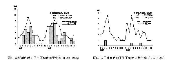 1) 子牛の下痢症が多発する農場では、凍結初乳の連続給与と親牛からの隔離・人工哺育は子牛の損耗率低下に有効な対策となる。