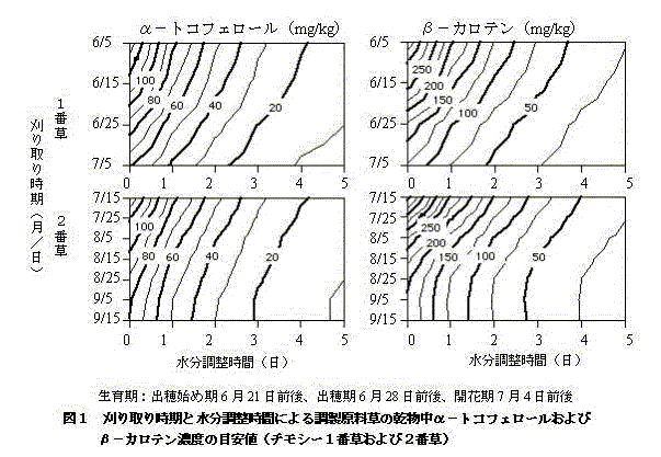 (5)番草別の刈り取り時期と水分調整時間から、調製原料草の乾物中α−トコフェロールおよびβ−カロテン濃度の目安値を予測する等高線図を作成した(図1)。