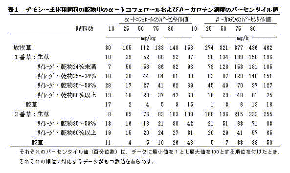 (2)乾物中のα−トコフェロールおよびβ−カロテン濃度は生草では放牧草>2番草生草>1番草生草の順であった。調製粗飼料では高・中水分サイレージ(乾物率34%以下)>低水分サイレージ(乾物率35%以上)>乾草の順であった。