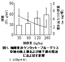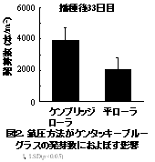 (1)芝生の造成では100kg/ha以上の大量の播種が一般的であるが、播種量が多いと面積当たりの茎数や根重が多くなる反面、一茎重や個体当たりの根重の発達が抑制された(試験1、図1)。家畜による採食や蹄傷に対する耐性を高めるためには、多量な播種は好ましくないと考えられた。また、播種量の少ない条件における発芽にはケンブリッジローラの方が平ローラよりも確実であった(試験2、図2)。