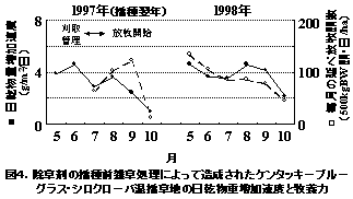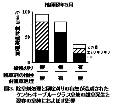 (2)KBの発芽定着と雑草防除には除草剤の播種前雑草処理の適用が有効である。播種当年の掃除刈りはエゾノギシギシ等の多年生雑草の防除には不十分であり、また、播種翌年に早春の草勢を低下させた(試験2、図3)。