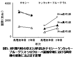(2)上記の刈り取り処理では、TY、KBいずれの草種でも刈り取り後に残葉が多量に確保されるため、刈り取り直後からの再生が旺盛で競争に強い。いずれの草種も10cm低刈り区における再生速度は30cm高刈り区よりも低下するが、KBの低下度合いがTYよりも小さいので、10cm低刈り区では相対的にKBが有利となる。
