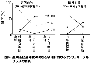 (3)TY・KB混播草地を造成後し、10cm低刈り処理と30cm高刈り処理に近い管理を定置放牧や輪換放牧などの放牧条件で行うと、前者では造成後数年で、後者ではより緩やかにKBが優占化すると期待された(試験5,図6)。また、その速度はKB播種量が多いほど大きかった。