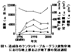 1) KB(品種名:トロイ)30kg/ha、WC(品種名:ソーニヤ)1kg/haを8月に播種して両草種の混播草地を造成した結果、KBの茎数密度は造成当年から10000本/m2前後で安定的に推移し、地下茎および根は造成翌年の利用初年目から2年目にかけて急激に発達したのちに安定化した(図1)。