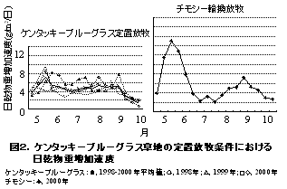 2) 利用2年目から、草丈10-20cmの短草利用による定置放牧を行った。このときのKB草地の季節生産性は、チモシーなどの長草型草種と比較してきわめて平準であり(図2)、省力的な放牧利用に有益な特徴を示した。