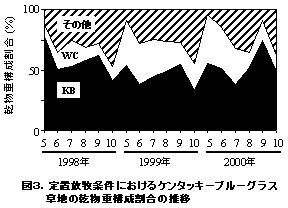 3)KBとWCは季節的な盛衰を繰り返しながら、マメ科率(乾物重構成割合)10〜40%の範囲で良好に混生した(図3)。植生変化に関するこれらの特性は永続的な草地の放牧利用に有益である。