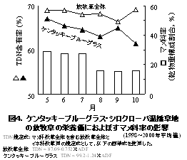 4)KB・WC混播草地において放牧草の主体を占めるKBのTDN含有率は5月に67%で最大となり、8月に63%まで低下し、9月にやや向上したが10月に再び低下した(図4)。一方、放牧草全体のTDN含有率は66〜69%の範囲にあり、季節変動は小さかった(表1、図4)。このことは、WCの混生によって放牧草全体のTDN含有率が大きく改善され、季節変動も軽減されたことを示している(図4)。