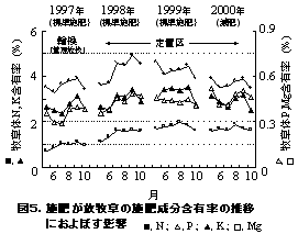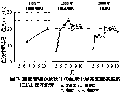 6)北海道施肥標準に準じた施肥量で管理された1998-1999年における放牧草の施肥成分含量は経時的に増大した(図5)。また、それらを採食した放牧牛の血液中の尿素態窒素濃度は明らかに上昇し、摂取した窒素の無駄や雌牛では繁殖障害の危険性が指摘される水準(20mg/dL以上)に至った(図6)。