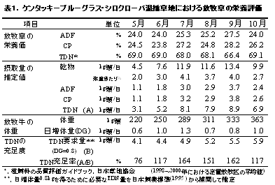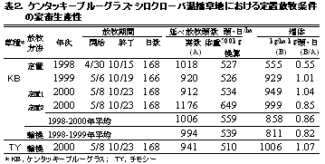 5)KB・WC混播草地は定置放牧条件でも集約的な短期輪換放牧に遜色ない生産性を示した(表1)。その水準はチモシーの輪換放牧条件におよばないものの、放牧日数168日間、延べ放牧頭数を体重500kg換算で559頭・日/haとした場合、ヘクタール当たり増体量858kg/ha、日増体量0.86kgと良好なものであった(表1)。1998年における低い増体の一因は6月の過放牧にあると思われた。本放牧条件で増体を高水準に維持するには放牧頭数の季節的な調節が重要と考えられた。