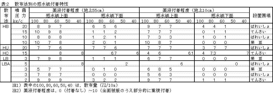 高圧ブーム散布(HB)及び吹上散布(HU)は、噴霧圧力15kg/cm2以上で作物草冠部に設置した感水紙上面へ充分量付着したが、噴霧圧力10kg/cm2 時のHB散布60〜80L/10aでは、地際近傍に設置した感水紙上面への付着が不均一となった。感水紙裏面への付着はHU、HC散布がHB散布に比べ多い傾向にあった(表2)。LBA散布は、噴霧圧力2〜5kg/cm2で感水紙上面に充分付着したが、下面付着量は僅少であり、さらにてんさいへの散布では、葉の展開角度や重なり程度が一定でなく、表裏面への付着程度にばらつきが多かった。散布時のドリフト量を25%程度に抑えるには、渦巻ノズルで噴霧圧力20kg/cm2程度、扇形ノズルでは、噴霧圧力2〜5kg/cm2での使用が望ましい。