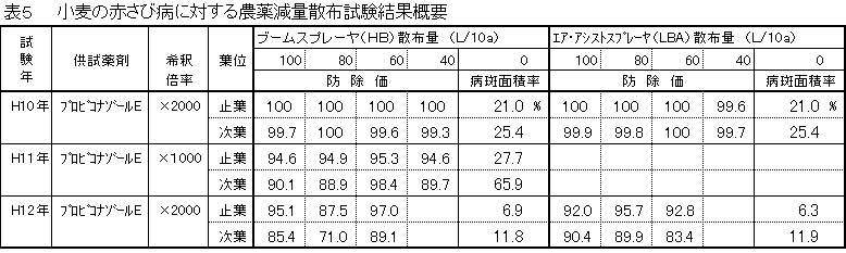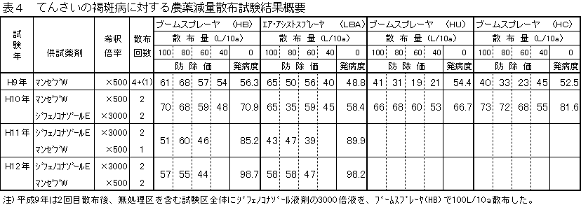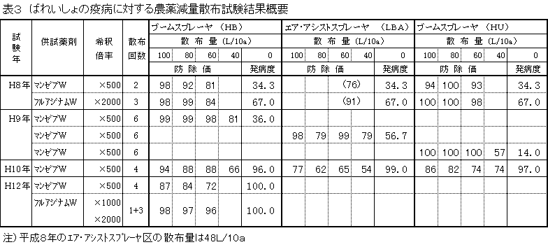 畑作物の主要病害虫に対する減量散布効果試験を5ヵ年にわたり行った結果、以下の病害虫に対して表記の方法による減量散布で、慣行の100L/10a散布と同等の効果が得られる(表3〜5)。