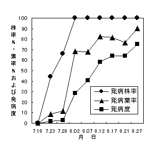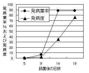 (2)接種試験:平成10年に罹病株から分生子を集め接種。その後の発病推移を24日間調査。