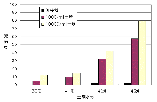 図1 土壌水分と乾腐病の発病(播種後99日目ニンジンを各水分の土壌中で接種)