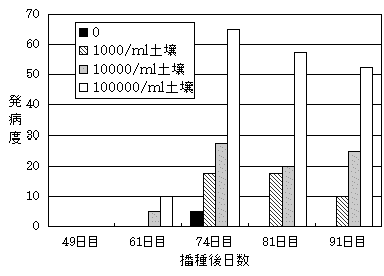 5)防除試験:マンゼブ剤の300リットル/10a潅注は20〜40ほどの防除価であったが実用性はない。カルシウム剤葉面散布によって感染耐性の付与はできなかった。紙筒移植によって感染を回避できたが、根部の変形によって商品とはならず、低収でもあった。