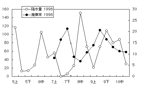 図3 JA亀田におけるニンジンの廃棄率と降水量の関係