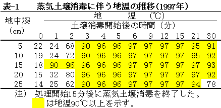 1)作土層内(0〜25cm)のスイカ半身萎凋病菌(V. dahliae)を含む糸状菌の死滅に要する蒸気土壌消毒処理時間は90℃以上になってから9分であった(表-1、2)。なお、本試験の結果では処理開始後12分に相当した。