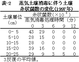 させ、蒸気土壌消毒を行い、経時的に試験管を取り出し、PDA培地を用いて死滅状況を調査した。また、蒸気土壌消毒に伴う地温の推移と土層別に土壌糸状菌数(ロースベンガル培地)の変化を調査した。