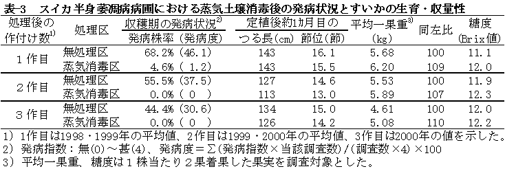 3)軽減効果の検討:1997年にセンター内のハウス1棟にV. dahliaeの病圃を造成後、①無処理区、②蒸気土壌消毒区(1997年秋に12分処理)、③同区(1998年秋に12分処理)、④太陽熱消毒区の計4処理区(各20㎡)を設置した。1998〜2000年の3カ年に渡りすいかを無加温半促成栽培し、スイカ半身萎凋病の軽減効果とすいかの生育・収量性を経時的に検討した。