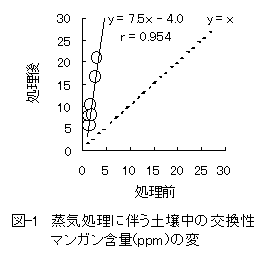 5)蒸気土壌消毒処理に伴う土壌化学性の変化は、有機態窒素の無機化によるアンモニア態窒素の増加と交換性マンガンの増加であった(図-1)。これらは蒸気処理に伴い一時的に形態変化を起こして急増するが、時間の経過ととも減少する傾向にあった。