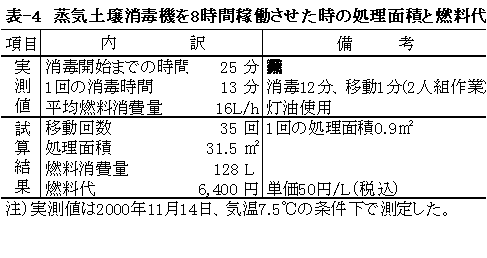 7)蒸気土壌消毒機を1日当たり8時間稼働させた場合の処理面積は消毒時間12分/回で31.5㎡、灯油(税込単価50円)を用いた燃料代は6,400円と試算された(表-4)。また、育苗床土1m3当たりに対する蒸気土壌消毒の所要時間は消毒時間15分/回で1.3〜1.8時間、燃料代は1,051〜1,400円と試算された。