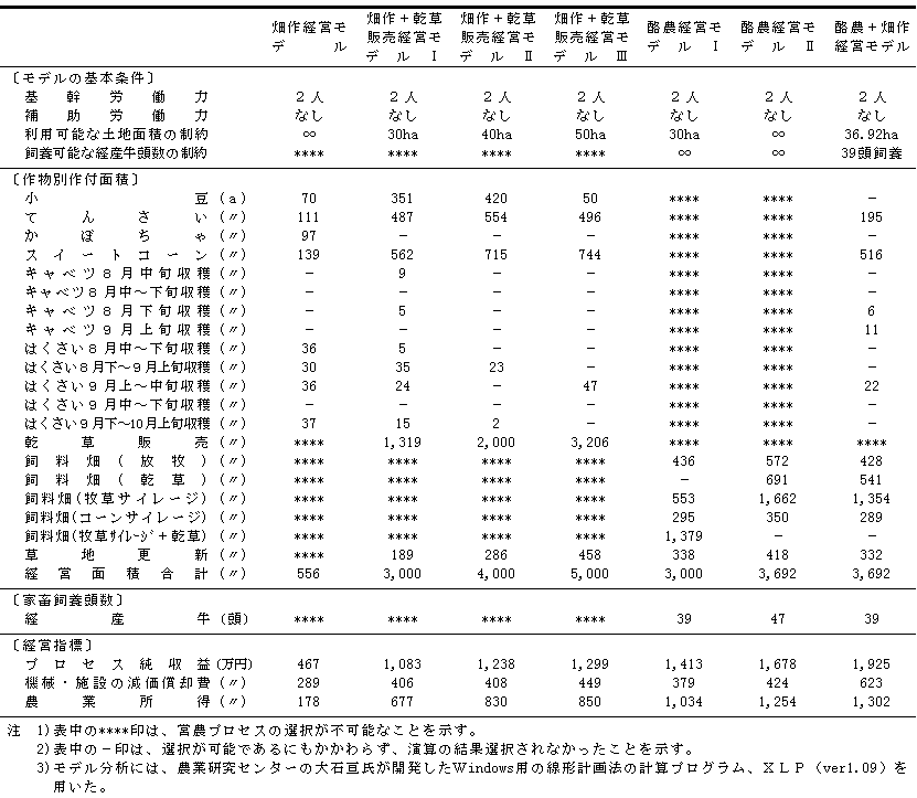 4)モデル分析によってその経済合理性が確認されたことから、当該地域においては、畑作に乾草販売を組み合わせたタイプの経営を育成して行くことによって野菜振興を図ることが可能であると考えられた。ただし、このタイプの経営を成立させるためには、乾草の販路が確立されていることが最大の条件となり、この前提条件が崩れれば野菜作の導入もスムーズには行われない。また、てんさいの播種作業と移植作業、スイートコーンの収穫作業、さらには小豆の手取り除草作業について、それぞれ2〜4人の雇用労働力を導入することを前提としていることから、雇用労働力の確保がこのタイプの経営を成立させるための条件となる。