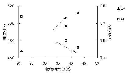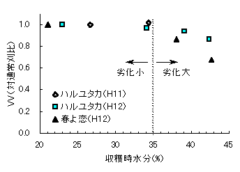 図2 収穫時水分と粒色(H12 「春よ恋」、循環式乾燥機)