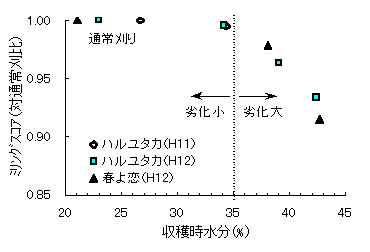 3)製粉性は高水分で収穫した小麦ほど劣る傾向にあるが、子実水分35%以下であれば通常収穫とほぼ同じであった(図3)。
