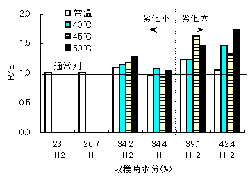 3)収穫時水分と乾燥温度:21.1〜26.7%(通常)、34.2〜42.7%(高水分);熱風温度40〜70℃