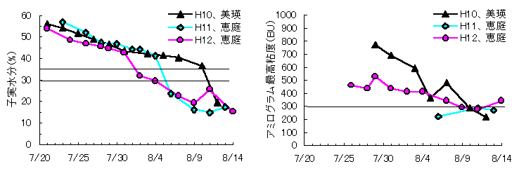 図6成熟期前後の子実水分、アミログラム最高粘度の推移