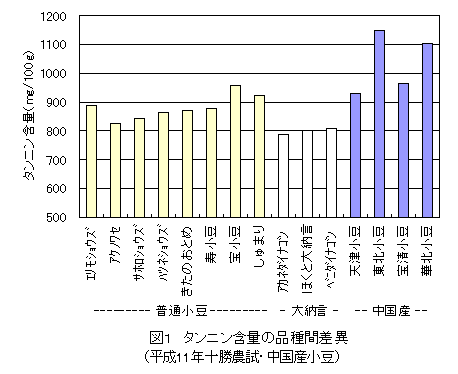 1)小豆のタンニン含量は、普通小豆に比べて大納言小豆では低く、中国産小豆では同程度か高い傾向にあった。また、栽培年次や栽培地によって差が認められた(図1)。