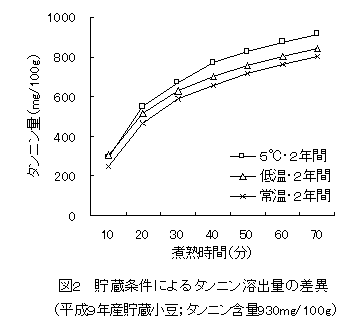 2)施肥量や追肥時期によるタンニン含量への影響は小さかったが、登熟程度の影響は大きく、登熟段階の早い時期(青莢)ではタンニン含量が高かった。同一品種では、小豆の百粒重(粒大)によってタンニン含量は大きく異なり、百粒重が小さいものほどタンニン含量は高かった。貯蔵条件としては、常温貯蔵よりも5℃貯蔵で煮熟過程におけるタンニンの溶出速度が速く、貯蔵温度が低いほど渋が切れやすい傾向にあった(図2)。