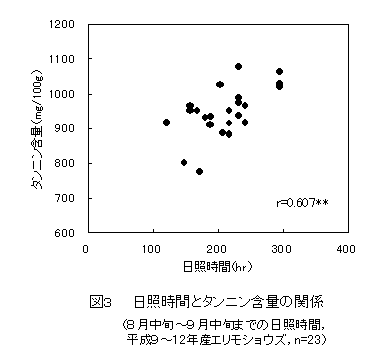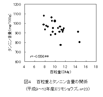 3)小豆の登熟期間の気象条件としては、8月中旬〜9月中旬までの日照時間とタンニン含量の間には有意な正の相関関係(r=0.607**,図3)が認められた。また、百粒重とタンニン含量の間には有意な負の相関関係(r=−0.556**,図4)が認められた。従って、登熟期間の日照時間が長く、百粒重が小さくなるような気象条件ではタンニン含量が高くなる傾向にあった。