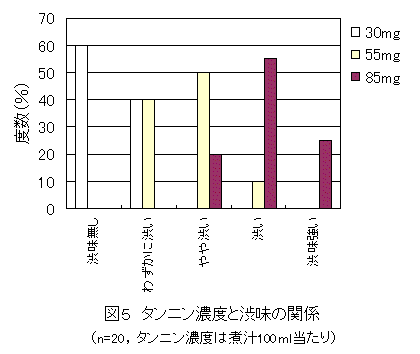 4)タンニン濃度と渋味の関係については、ほとんどの人が煮汁中のタンニン濃度が30mg/100ml以下では渋味を感じないが、50mg/100ml以上では渋味を感じ、85mg/100ml以上では強い渋味を感じることが明らかとなった(図5)。