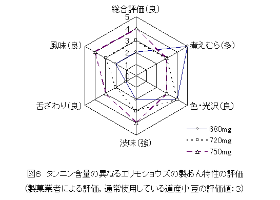 5)加糖あんに加工した場合には、タンニン含量の差が食味に及ぼす影響は小さく、加工業者の製あん技術(渋切り等)により、その影響は小さくなるものと考えられた(図6)。